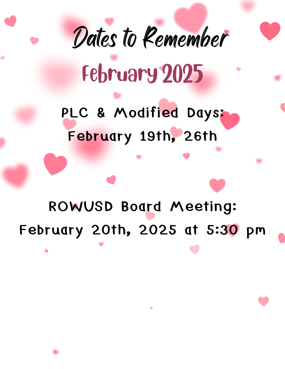 Page Two: Dates to Remember-February 2025; PLC & Modified Days: February 19th, 26th February 17th, 2025 No School-Presidents’ Day ROWUSD Board Meeting: February 20th, 2025 at 5:30 pm