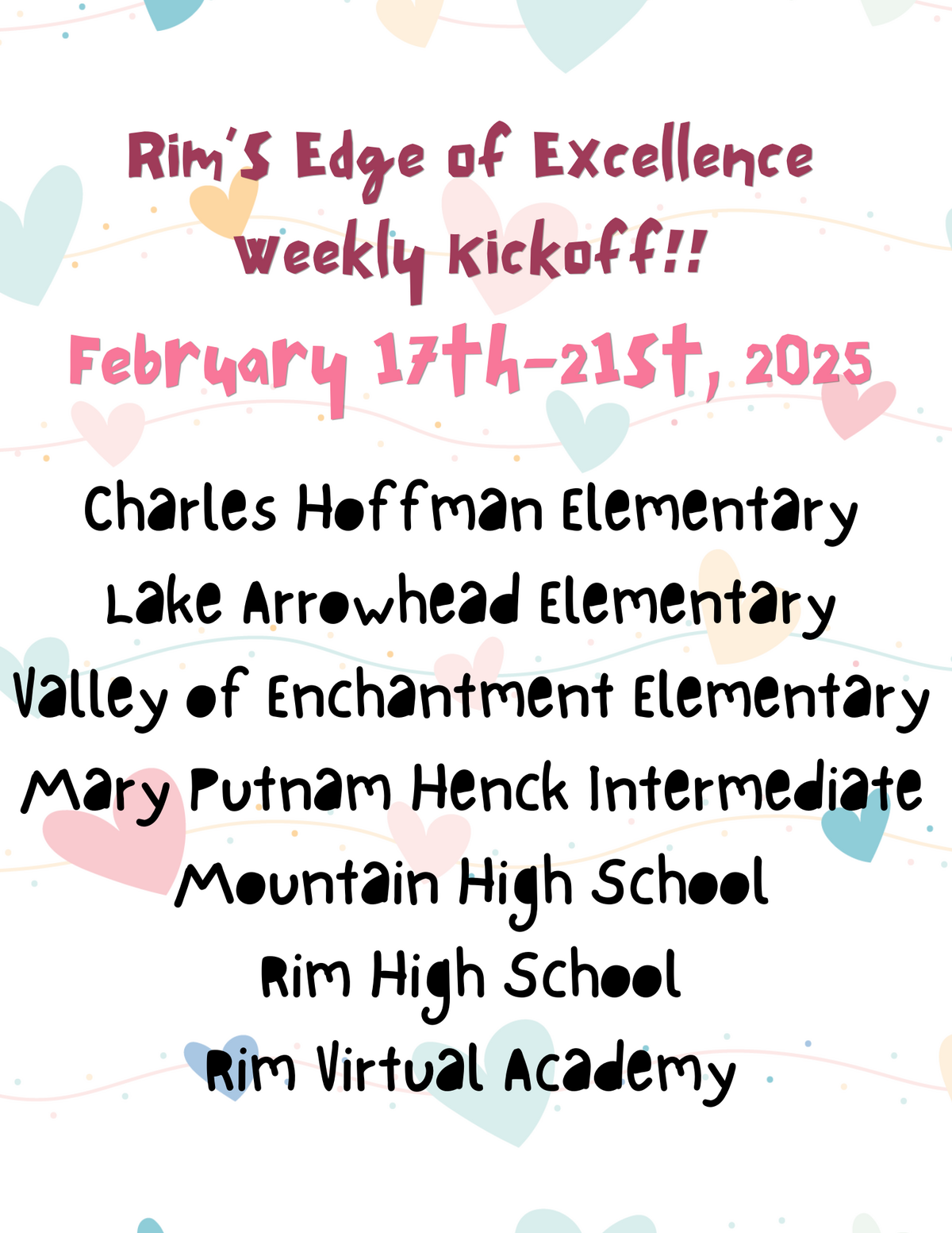 Page One: Rim’s Edge of Excellence Weekly Kickoff!! February 17th-21st, 2025; Charles Hoffman Elementary Lake Arrowhead Elementary Valley of Enchantment Elementary Mary Putnam Henck Intermediate Mountain High School Rim High School Rim Virtual Academy