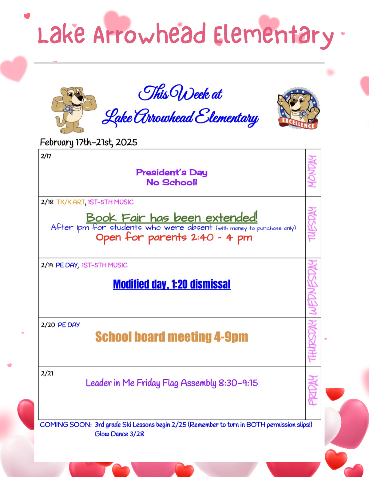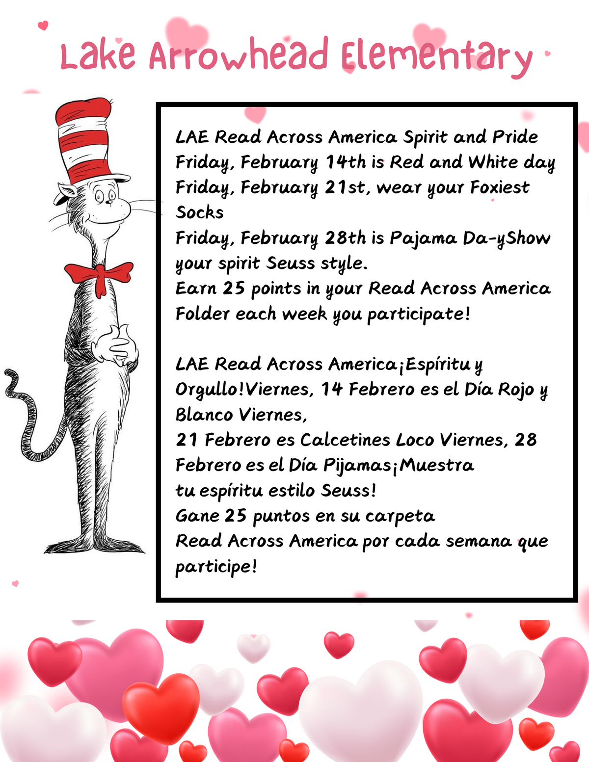 Page Seven & Eight: This week at LAE: Monday 2/17-No School due to Presidents' Day.; Tuesday 2/18: TK & K Art, 1st-5th Grads Music; Book Fair Has Been Extended after 1 pm for students who were absent (with money to purchase) Open for parents from 2:40 pm to 4 pm.; Wednesday 2/19-PE Day, 1st-5th Grades Music. Modified Day-school dismissal is at 1:20 pm. Thursday 2/20- PE Day, School Board Meeting at 5:30 pm for the public. ; Friday 2/21- Leader in Me Flag Assembly from 8:30 am to 9:15 am. Coming Soon: 3rd Grade Ski Lessons begin 2/25. (Remember to turn in BOTH permission slips!) Glow Dance will be held on 3/28. LAE Read Across America Spirit and Pride Friday, February 14th is Red and White day Friday, February 21st, wear your Foxiest Socks Friday, February 28th is Pajama Da-yShow your spirit Seuss style. Earn 25 points in your Read Across America Folder each week you participate! LAE Read Across America¡EspĂritu y Orgullo!Viernes, 14 Febrero es el DĂa Rojo y Blanco Viernes,  21 Febrero es Calcetines Loco Viernes, 28 Febrero es el DĂa Pijamas¡Muestra tu espĂritu estilo Seuss!  Gane 25 puntos en su carpeta Read Across America por cada semana que participe! Â