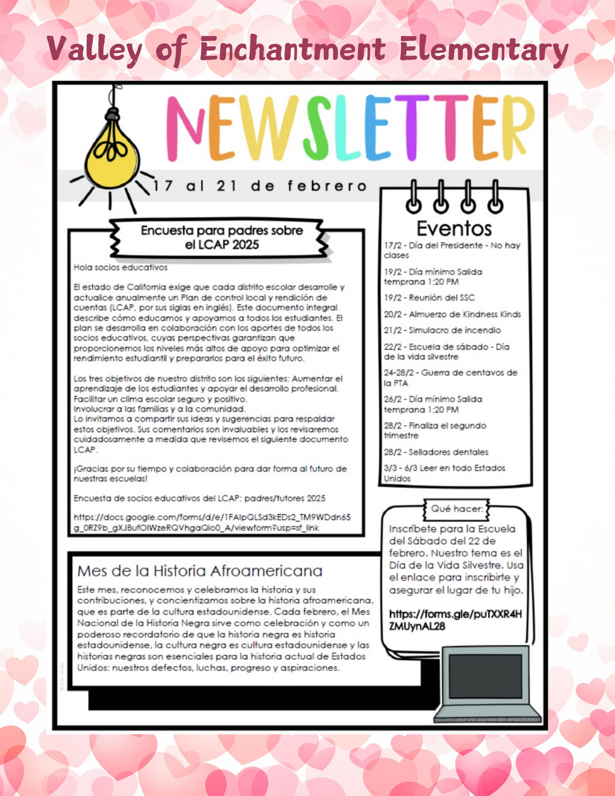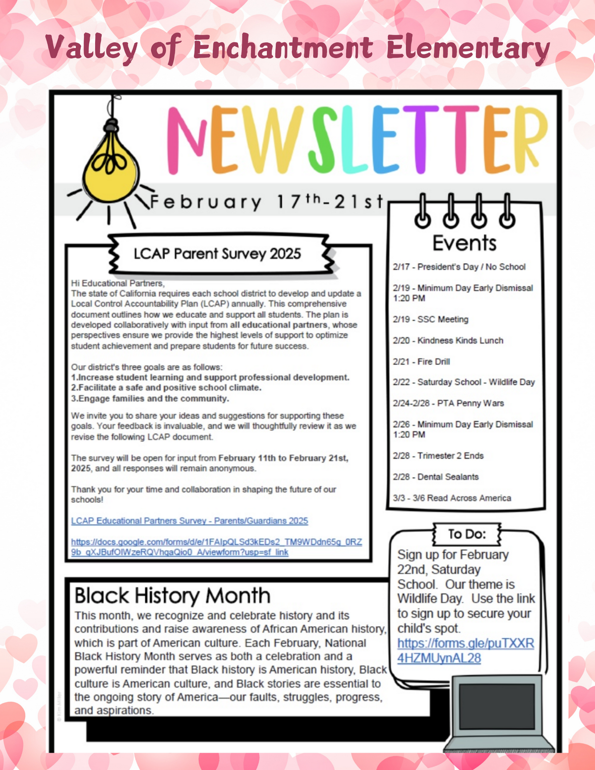 Pages Nine & Ten: Hi Educational Partners, The State of CA requires each school district to develop  and update a Local Control Accountability Plan (LCAP) annually. This comprehensive document outlines how we educate and support all students. The plan is developed collaboratively with impot from all educational partners, whose perspectives ensure we provide the highest levels of support to optimize student achievement and prepare students for future success.  Our district's 3 goals areL 1) increase student learning and support professional development. 2) facilitate a safe space and positive school climate, and 3) engage families and the community. We invite you to share your ideas and suggestions for supporting these goals. Your feedback is invaluable, and we will thoughtfully review it as we revise the following LCAP document. The survey will open for input from February 11th to February 21st, 2025., and all responses will remain anonymous.  Thank you for your time and collaboration in shaping the future of our schools./ This month, we recognize and celebrate history and its contributions and raise awareness of African American history, which is a part of the American culture.  Each February, National Black History Month serves as both a celebration and a powerful reminder that Black history is American history.  Black culture is American culture-our faults, struggles, our progress, and aspirations. .  Â