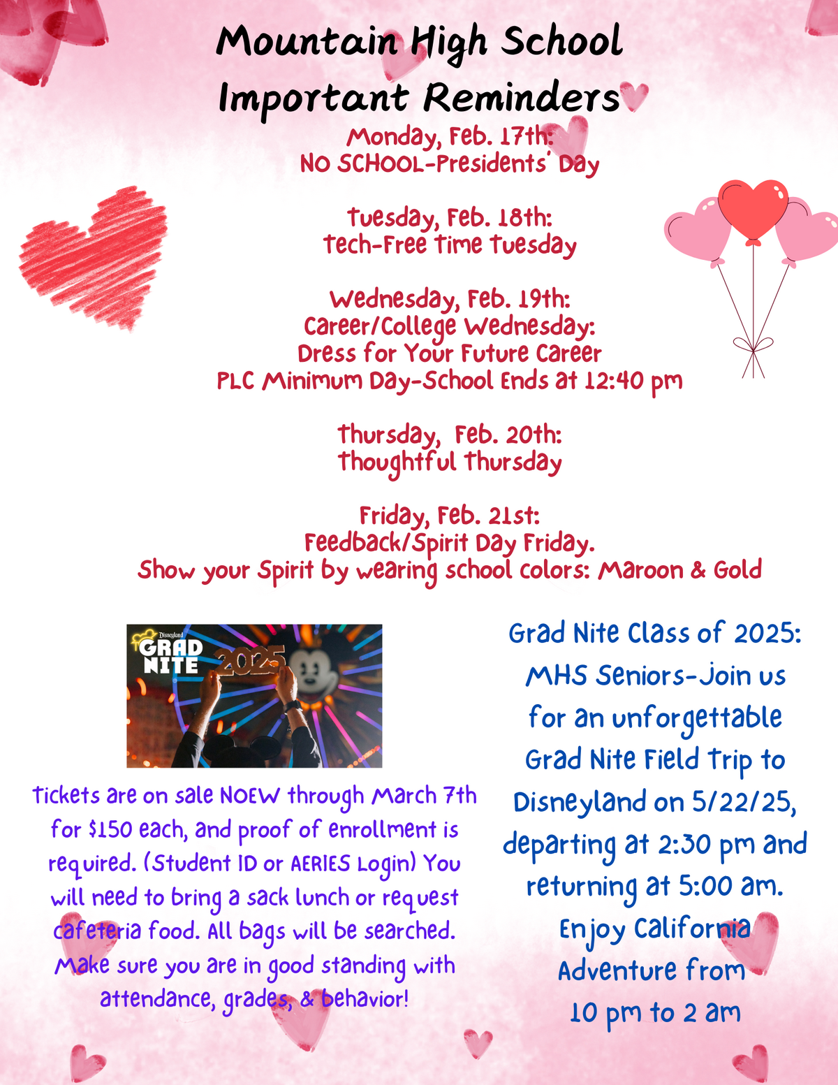 Page Twelve: Mountain High School Important Reminders.; Monday, Feb. 17th: NO SCHOOL-Presidents’ Day Tuesday, Feb. 18th: Tech-Free Time Tuesday Wednesday, Feb. 19th: Career/College Wednesday: Dress for Your Future Career PLC Minimum Day-School Ends at 12:40 pm Thursday,  Feb. 20th: Thoughtful Thursday Friday, Feb. 21st: Feedback/Spirit Day Friday. Show your Spirit by wearing school colors: Maroon & Gold.; Tickets are on sale NOEW through March 7th for $150 each, and proof of enrollment is required. (Student ID or AERIES Login) You will need to bring a sack lunch or request cafeteria food. All bags will be searched. Make sure you are in good standing with attendance, grades, & behavior!; Grad Nite Class of 2025: MHS Seniors-Join us for an unforgettable Grad Nite Field Trip to Disneyland on 5/22/25, departing at 2:30 pm and returning at 5:00 am. Enjoy California Adventure from 10 pm to 2 am
