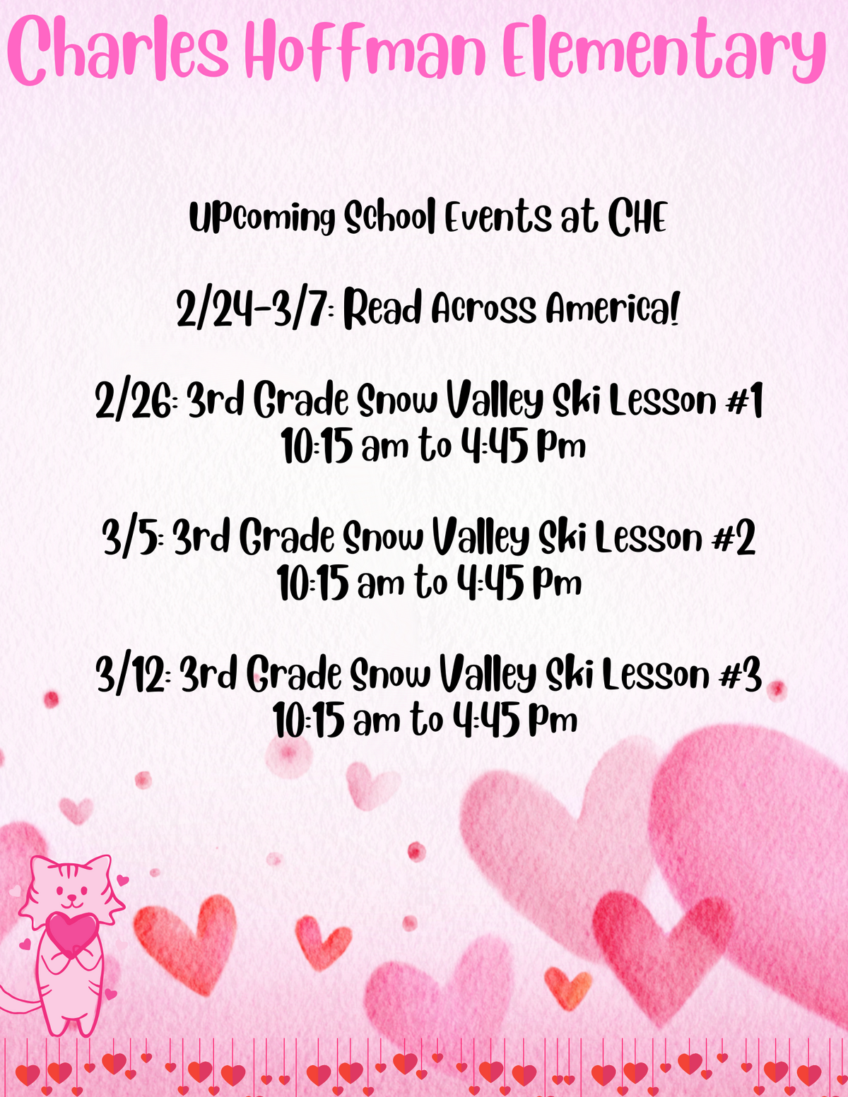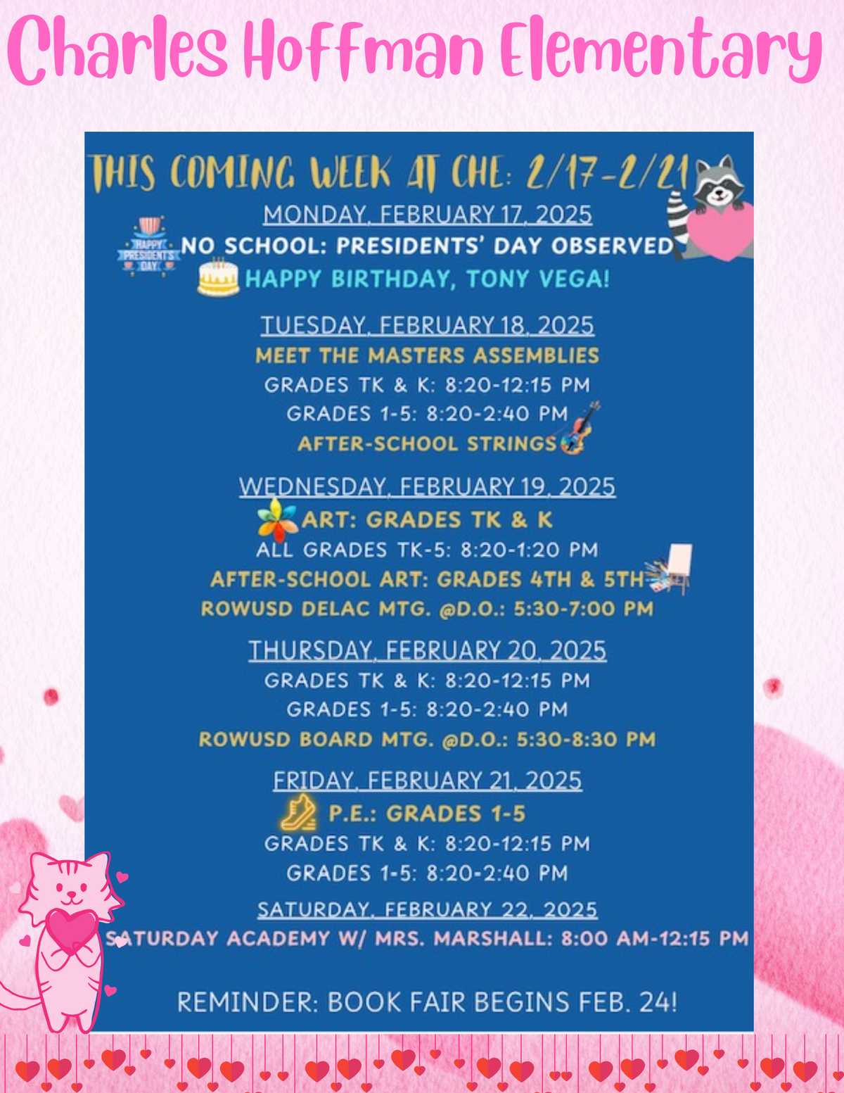 Page Five & Sis: This Coming Week at CHE 2/17/2025. Monday 2/17: No School-Presidents' Day Observed. Happy Birthday Tony Vega!; Tuesday, 2/18: Meet the Masters Assemblies. Grades TK & K- 8:20 am to 12:15 pm and Grades 1st-5th 8:20 am to 2:40 pm. After School Springs.; Wednesday, 2/19 ART Grades Tk & K. All grades will be released at TK-5: 8:20 am to 1:20 pm. After-School Art: Grades 4th-5th and ROWUSD DELAC Meeting at District Office 5:30 pm to 7:00 pm.; Thursday, 2/20: PE Grades 1-5. Grades TK & K 8:20 am to 12:15 pm. Grades 1-5: 1:20 pm to 2:40 pm. ROWUSD Board Meeting at DIstrict Office from 5:30 pm to 8:30 pm.; Friday, 2/21: PE Grades 1-5, Grades TK & K 8:20 am to 12:15 pm and Grades 1-5 at 8:20 am to 2:40 pm. Saturday, 2/22: Saturday Academy w/Mrs. Marshall from 8am to 12:15 pm.; Reminder: Book Fair Begins February 24th. / Â Upcoming School Events at CHE 2/24-3/7: Read Across America! 2/26: 3rd Grade Snow Valley Ski Lesson #1 10:15 am to 4:45 pm 3/5: 3rd Grade Snow Valley Ski Lesson #2 10:15 am to 4:45 pm 3/12: 3rd Grade Snow Valley Ski Lesson #3 10:15 am to 4:45 pm