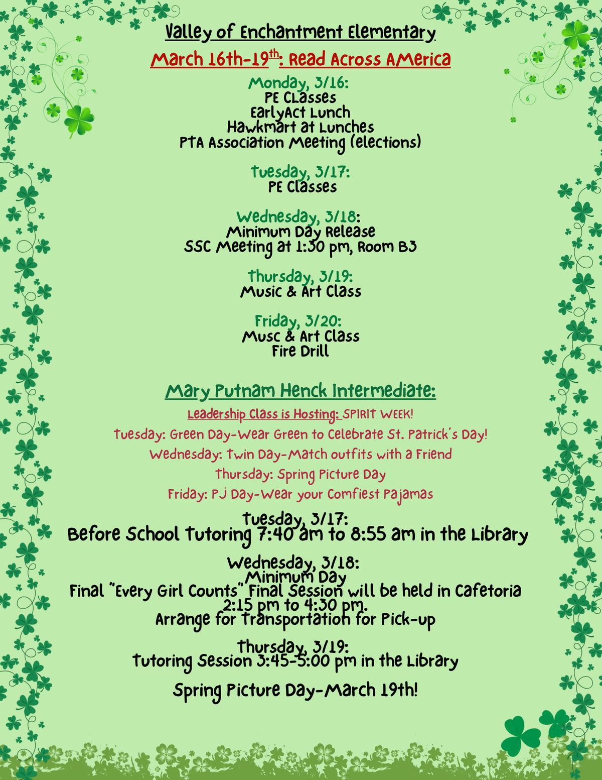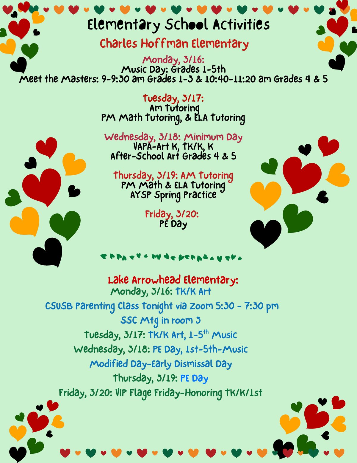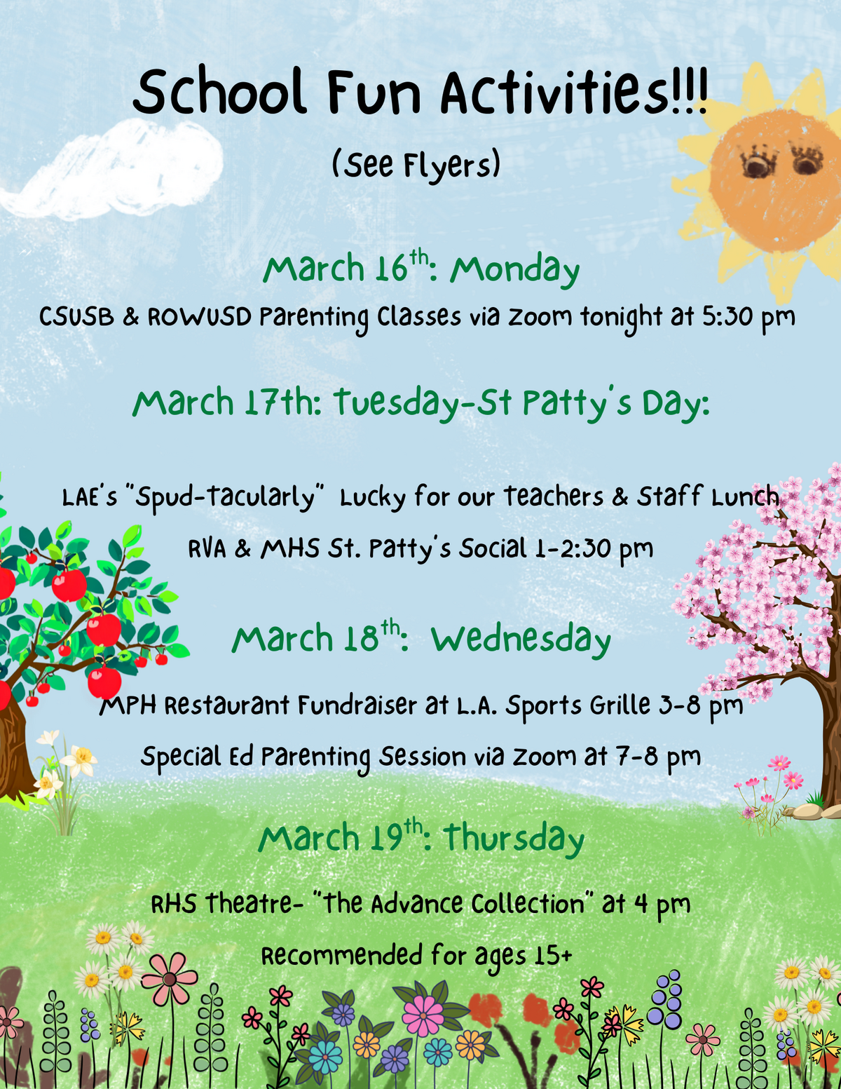 Page: School Fun Activities!!! (See Flyers) March 16th: Monday CSUSB & ROWUSD Parenting Classes via Zoom tonight at 5:30 pm  March 17th: Tuesday-St Patty’s Day: