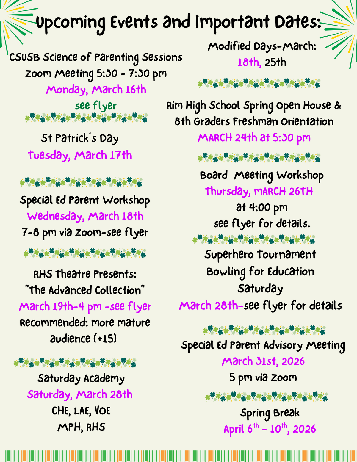 Page: Upcoming Events and Important Dates: CSUSB Science of Parenting Sessions Zoom Meeting 5:30 - 7:30 pm Monday, March 16th, see flyer. St Patrick’s Day