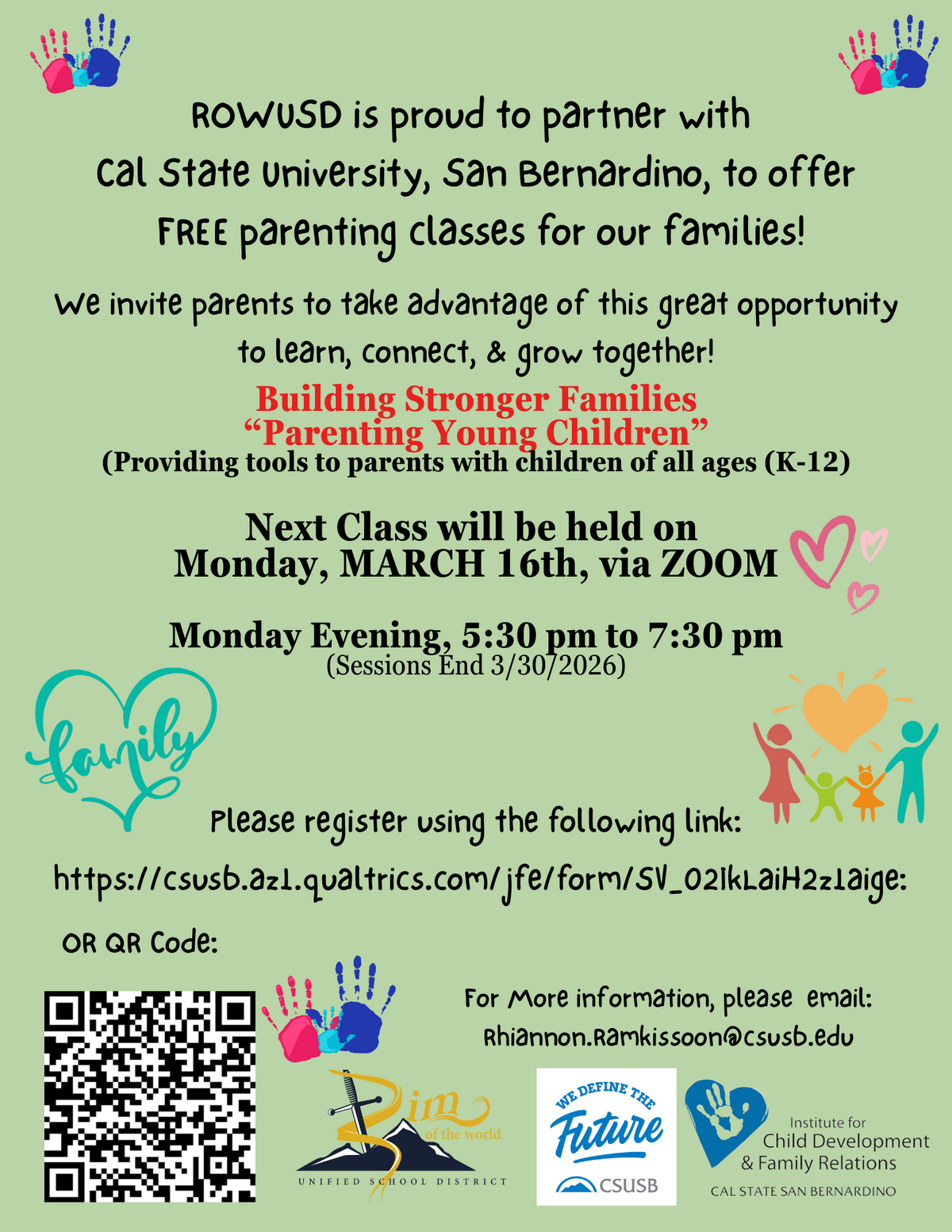 Page: ROWUSD is proud to partner with Cal State University, San Bernardino, to offer FREE parenting classes for our families! We invite parents to take advantage of this great opportunity to learn, connect, & grow together! Building Stronger Families “Parenting Young Children” (Providing tools to parents with children of all ages (K-12) Next Class will be held on  Monday, MARCH 16th, via ZOOM, Monday Evening, 5:30 pm to 7:30 pm (Sessions End 3/30/2026). Please register using the following link: https://csusb.az1.qualtrics.com/jfe/form/SV_02IkLaiH2z1aige: