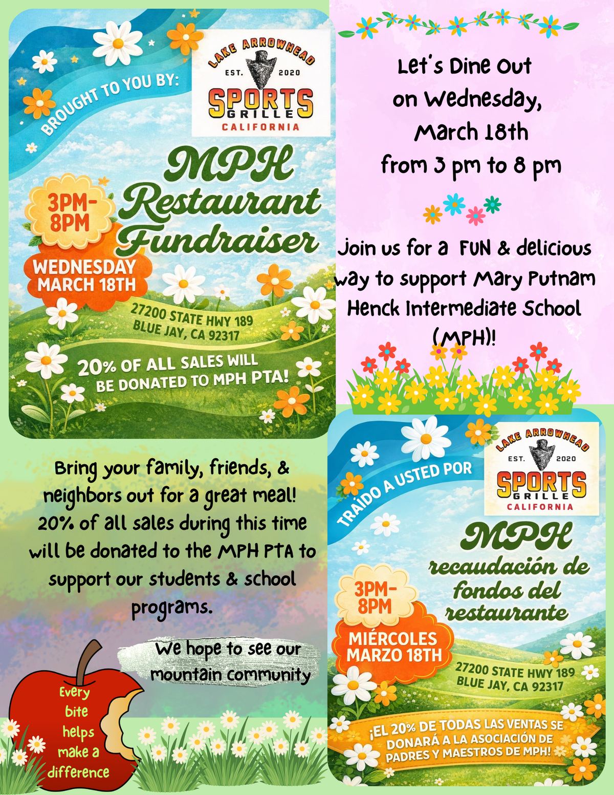 Page: Let’s Dine Out on Wednesday,  March 18th, from 3 pm to 8 pm. Join us for a  FUN & delicious way to support Mary Putnam Henck Intermediate School (MPH)! Bring your family, friends, & neighbors out for a great meal!  20% of all sales during this time will be donated to the MPH PTA to support our students & school programs. We hope to see our mountain community. Every bite helps make a difference. MPH Restaurant Fundraiser at Lake Arrowhead Sports Grille, California, from 3 pm to 8 pm on Wednesday, March 18th. Located at 27200 State Hwy 189, Blue Jay, CA 92317. 20% of all sales will be donated to MPH PTA. Traido a usted por MPH recauacion de fondos del restaurante from 3 pm to 8 pm on Miercoles Marzo 18th, located at 27200 State Hwy 189, Blue Jay, CA 92317. jEL 20% DE TODAS LAS VENTAS SE DONARA A LA ASOCIADION DE PADRES Y MAESTROS DE MPH