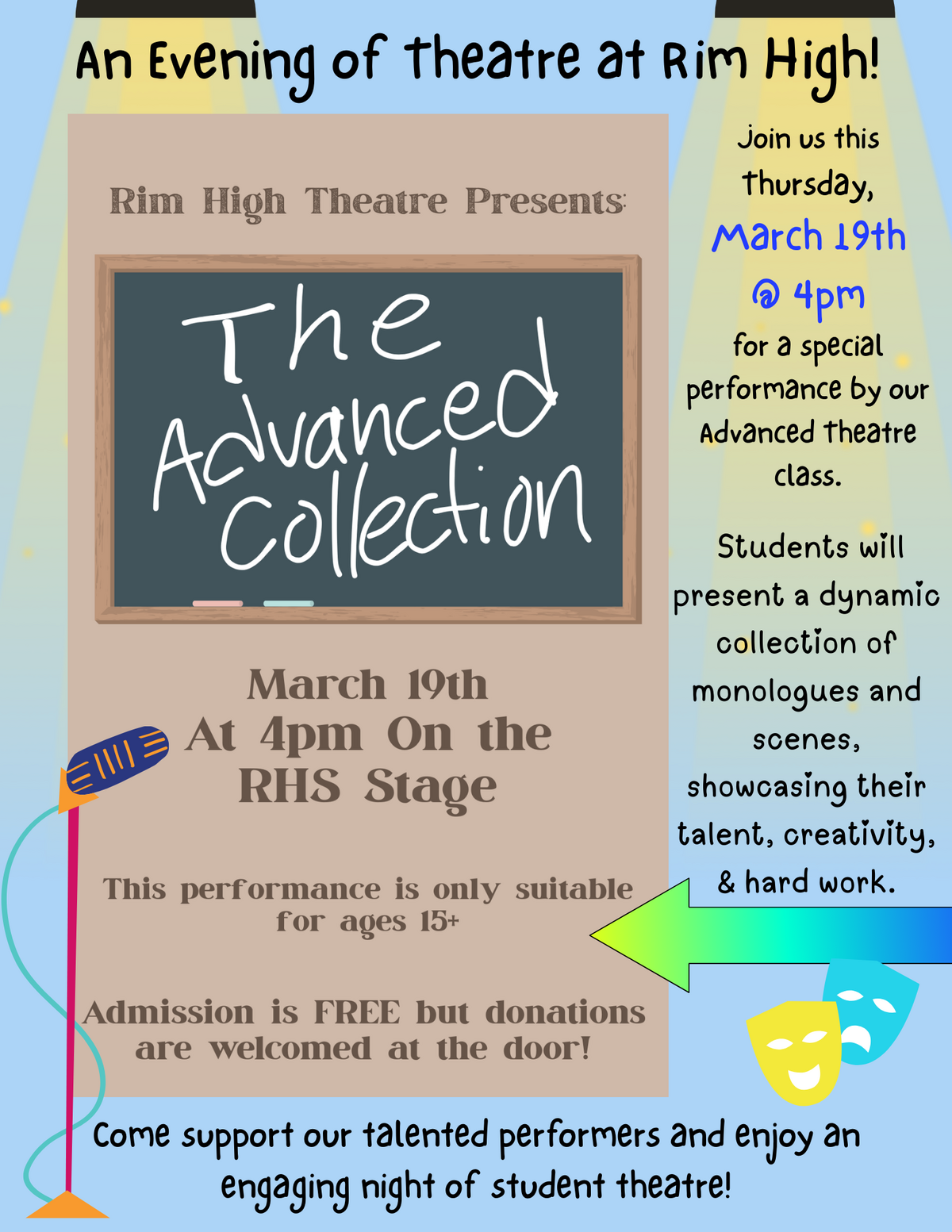 Page: An Evening of Theatre at Rim High! Join us this Thursday, March 19th @ 4 pm for a special performance by our Advanced Theatre class. Students will present a dynamic collection of monologues and scenes, showcasing their talent, creativity, & hard work. Come support our talented performers and enjoy an engaging night of student theatre! Rim High Theatre Presents "The Advanced Collection" on March 19th at 4 pm on the RHS Stage. This performance is only suitable for ages 15+. Admission is FREE, but donations are welcome at the door. Come support our talented performers and enjoy an engaging night of student theatre.