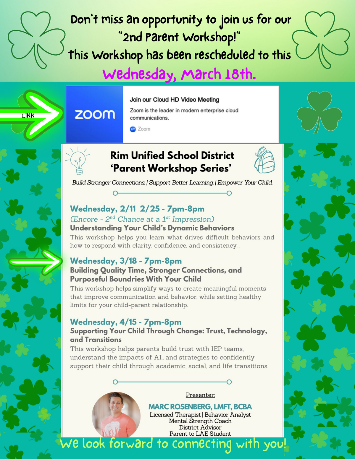 Page: Special Education “Parent Workshop Series” RIM Unified School District "Parent Workshop Series". Build Stronger Connections/Support Better Learning/Empower Your Child. Wednesday,2/25 from 7 pm to 8 pm. (Encore 2 Chance at 1st Impression). Understanding Your Child's Dynamic Behaviors: This workshop helps you learn what drives difficult behaviors and how to respond with clarity, confidence, and consistency.