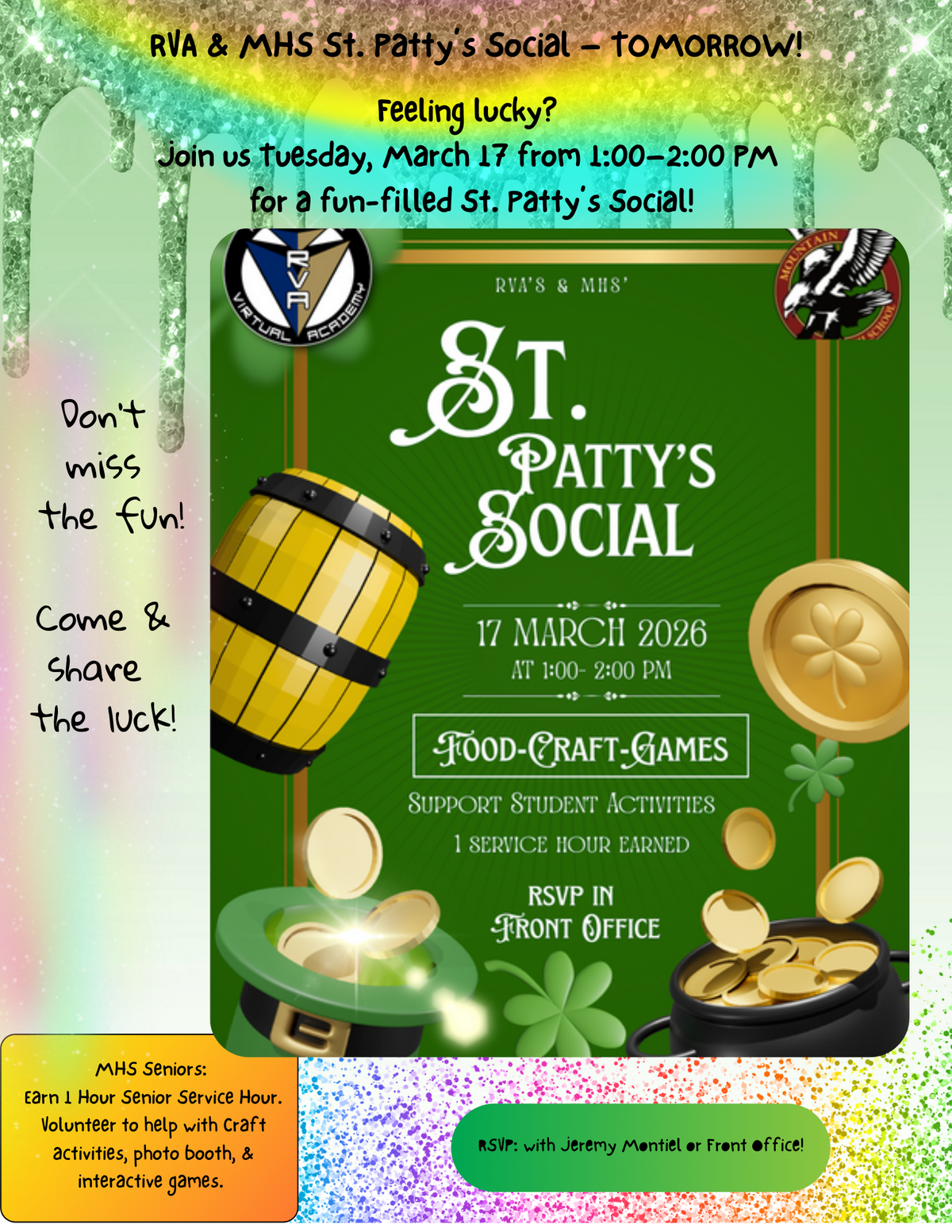the fun! Come & share the luck! MHS Seniors:  Earn 1 Hour Senior Service Hour. Volunteer to help with Craft activities, photo booth, & interactive games. RSVP: with Jeremy Montiel or Front Office! St Patty's Social-March 17th, 2026, at 1 pm - 2 pm. Food, craft, and Games. Support Student activities. 1 service hour earned. RSVP in the front office.