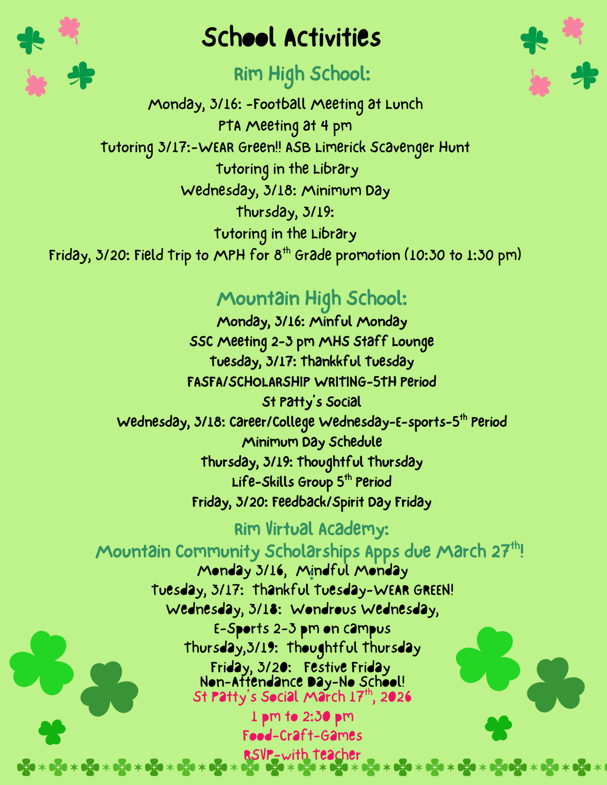 18th, 25th. Rim High School Spring Open House & 8th Graders Freshman Orientation MARCH 24th at 5:30 pm. Board  Meeting Workshop