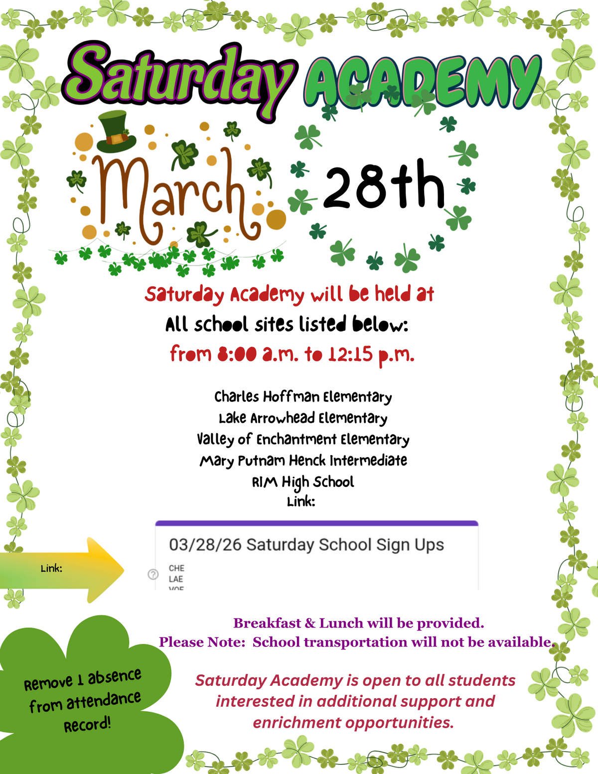 Please note:  School transportation will not be available. Saturday Academy is open to all students interested in additional support and enrichment opportunities. Remove 1 absence from the attendance Record!