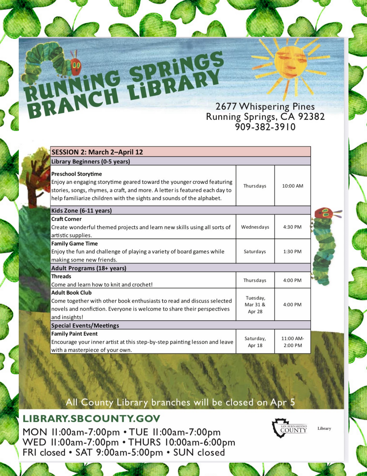 Page: Running Spring Branch Library: 2677 Whispering Pines, Running Springs, CA 92382 (909) 382-3910.