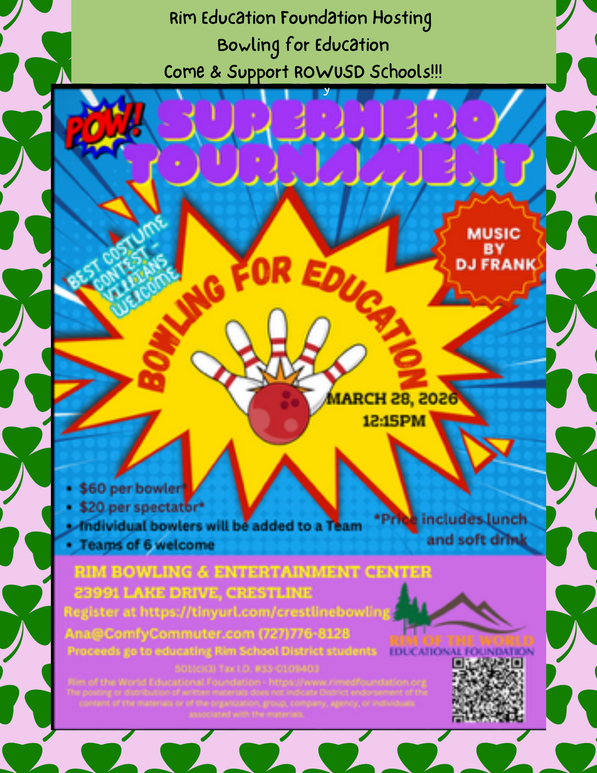 Page: Come & Support ROWUSD Schools!!! SuperHero Tournament. Best Costumes..Villains Welcome. Bowlig for Education. March 28th, 2026. Music by DJ Frank. $60 per bowler, $20 per spectator.. Individual bowlers will be added to a team. Teams of 6 welcome. Price includes lunch and a drink. Rim Bowling & Entertainment Center. 23991 Lake Drive, Crestline, CA 92325. Register at: https://tinyurl.com/crestlinebowling Ana@ComfyCommuter.com or call (727) 776-8128. Proceeds support student education in the Rim School District. 501(c)(3) Tax ID# 33-0109403 Rim of the World Educational Foundation\https:////////www.rimedfoundation.org